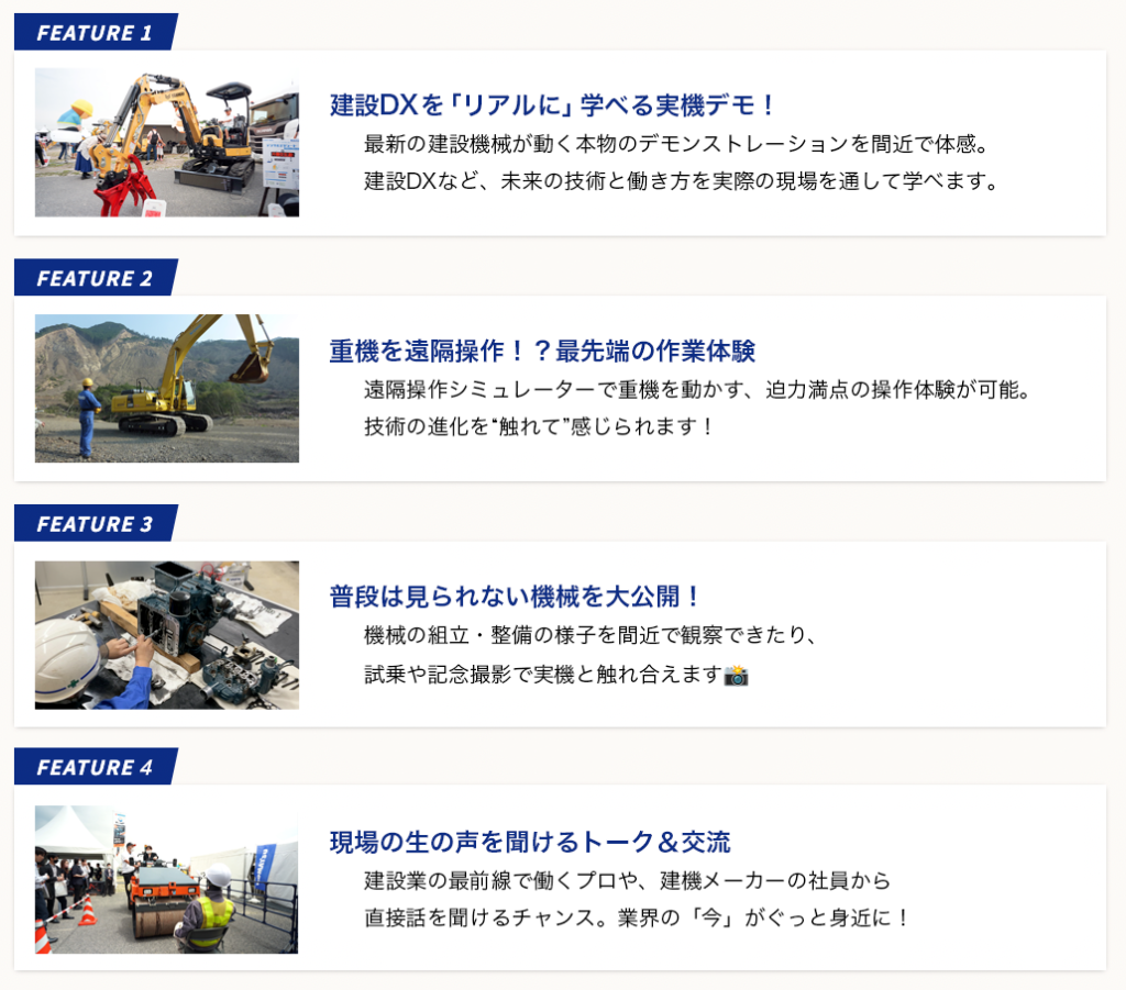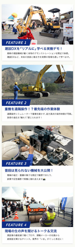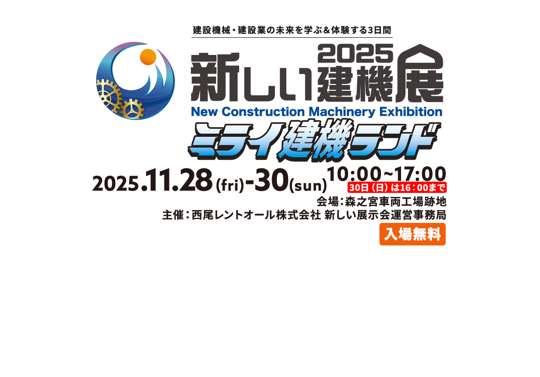 今年の「新しい建機展」は、会場を森ノ宮に移し、スケールも内容も大幅にパワーアップ! 未来の建設現場を担う若者たちや、好奇心いっぱいの子どもたちが最先端の建設技術を "見て・触れて・体感できる"、まさにワクワクが止まらない体験型イベントです! 今年の「新しい建機展」は、会場を森ノ宮に移し、スケールも内容も大幅にパワーアップ! 未来の建設現場を担う若者たちや、好奇心いっぱいの子どもたちが最先端の建設技術を "見て・触れて・体感できる"、まさにワクワクが止まらない体験型イベントです! 新しい建機展2025 「ミライ建機ランド」の特徴 お知らせ 2025年11月11日 NEW! 体験・実演ブースのスケジュールを公開しました! 2025年11月5日 NEW! 会場レイアウトを公開しました! 2025年10月28日 出展ブース情報、最新ラインナップを公開 2025年10月23日 11月30日(日)は16時閉幕となります 2025年9月3日 「新しい建機展」大阪・森ノ宮で開催決定!詳細は随時更新予定です。 会場 会場: 森之宮車両工場跡地 住所:大阪府大阪市城東区森之宮1丁目6 アクセス ※駐車場はございません。公共交通機関をご利用ください。 ◇シャトルバスのご案内 ●JR環状線「大阪城公園」駅からシャトルバスを運行します。 JR環状線「大阪城公園」駅バス乗り場 バスNo.1 JR環状線「大阪城公園」駅→イベント会場 (10時台~15時台) 毎時0分、30分発車 バスNo.2 イベント会場→ JR環状線「大阪城公園」駅 (11時台~16時台) 毎時15分、45分発車 ◇電車・バスでお越しの皆様 ・大阪メトロ「森ノ宮駅」④出口より徒歩約10分 ・JR「森ノ宮駅」北口より徒歩約11分 お問い合わせ 西尾レントオール株式会社 新しい展示会運営事務局 (西尾レントオール株式会社RA大阪営業所内) 〒536-0014 大阪府大阪市城東区鴫野西2-6-8TEL:06-4258-2401 FAX:06-4258-2404 E-mail:ataten@nishio-rent.co.jp
