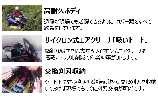 ・凹型デザインの「カマキリフロント」で高い草や密集した草を一押しで効率よくカット!!