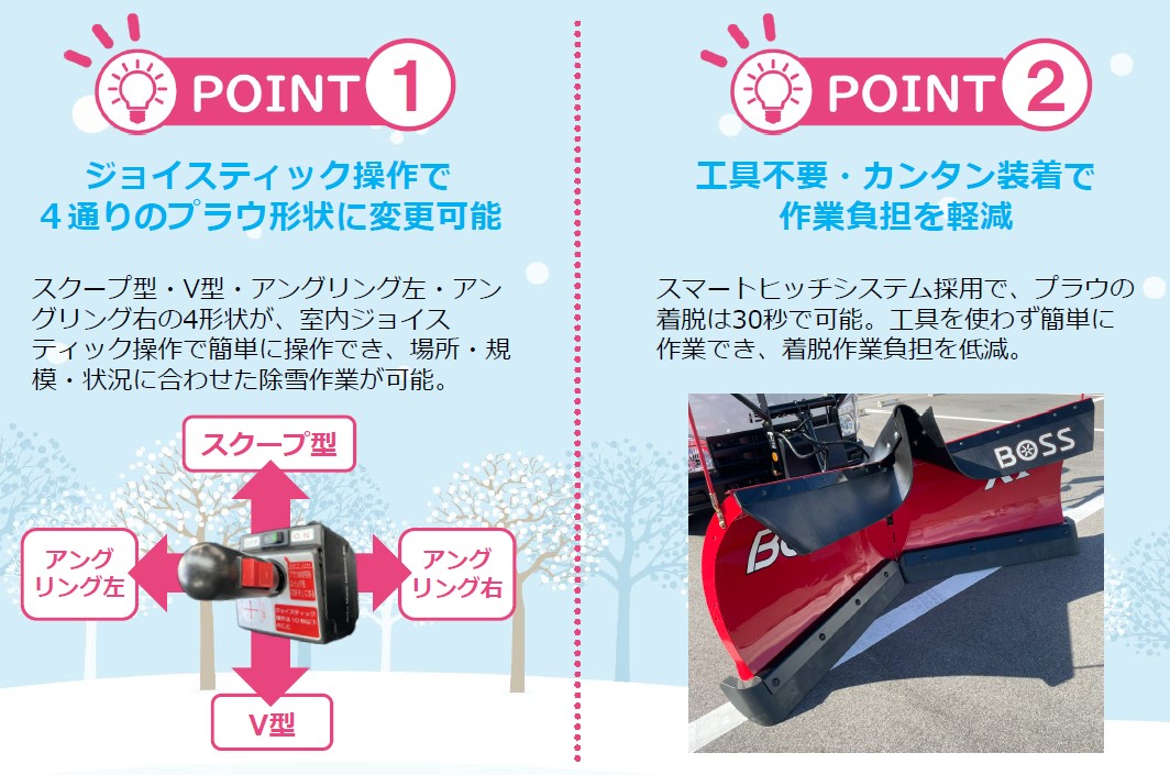 スクープ型・V型・アングリング左・アングリング右の4形状が、室内ジョイスティック操作で簡単に操作でき、場所・規模・状況に合わせた除雪作業が可能。