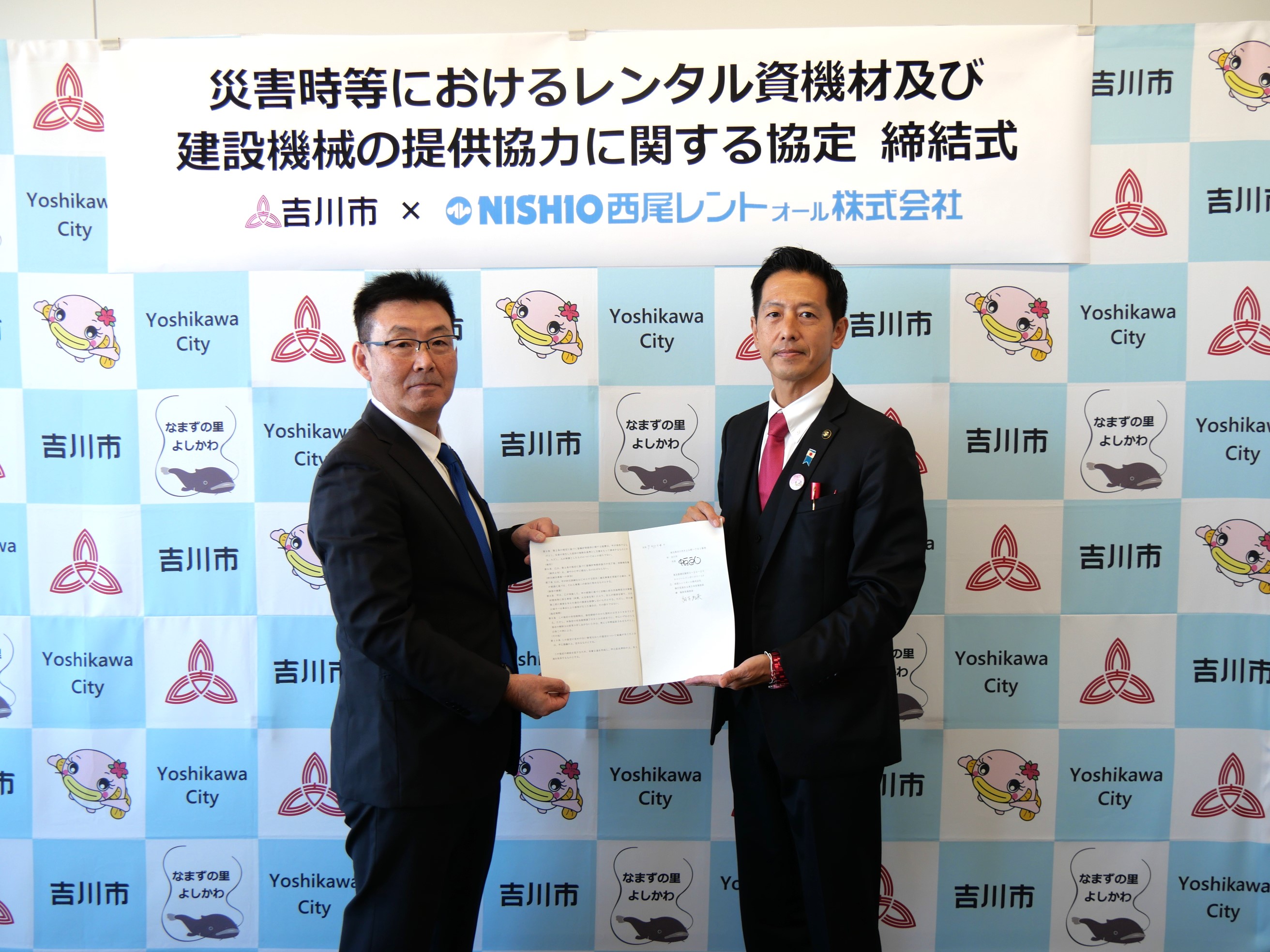 ニシオホールディングス株式会社傘下の西尾レントオール株式会社(本社:大阪府大阪市、代表取締役社長:西尾 公志)は、埼玉県吉川市(市長:中原 恵人)と、災害発生時に復旧作業等の遂行にあたり、必要な資機材を円滑に調達できる体制を整備することを目的とした「災害時等におけるレンタル資機材及び建設機械の提供協力に関する協定」を締結しました。