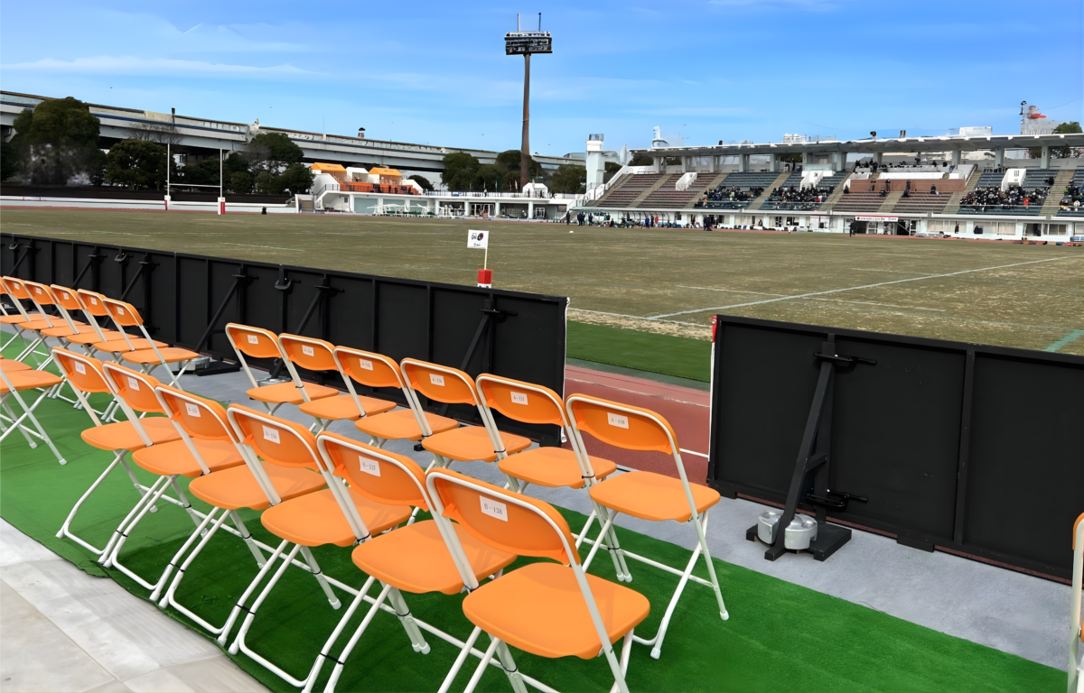 「スマートシート」でピッチ上に設けられたひな型ベンチタイプの特設観覧席です。