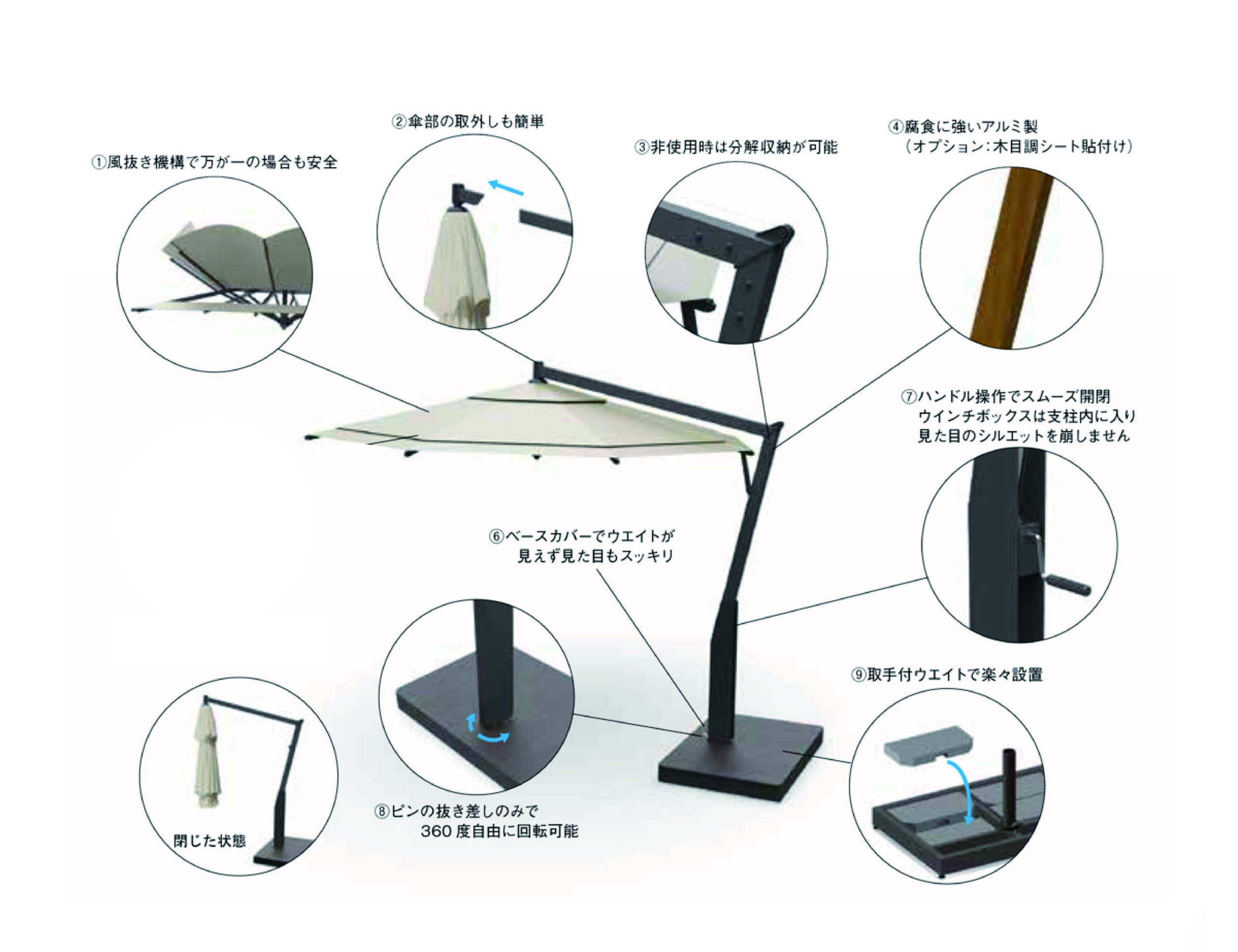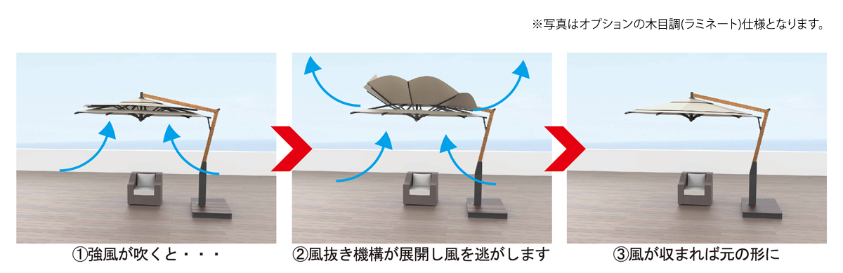 ・強風時は風抜き機構が自動開閉しパラソルの転倒・破損を防止します。