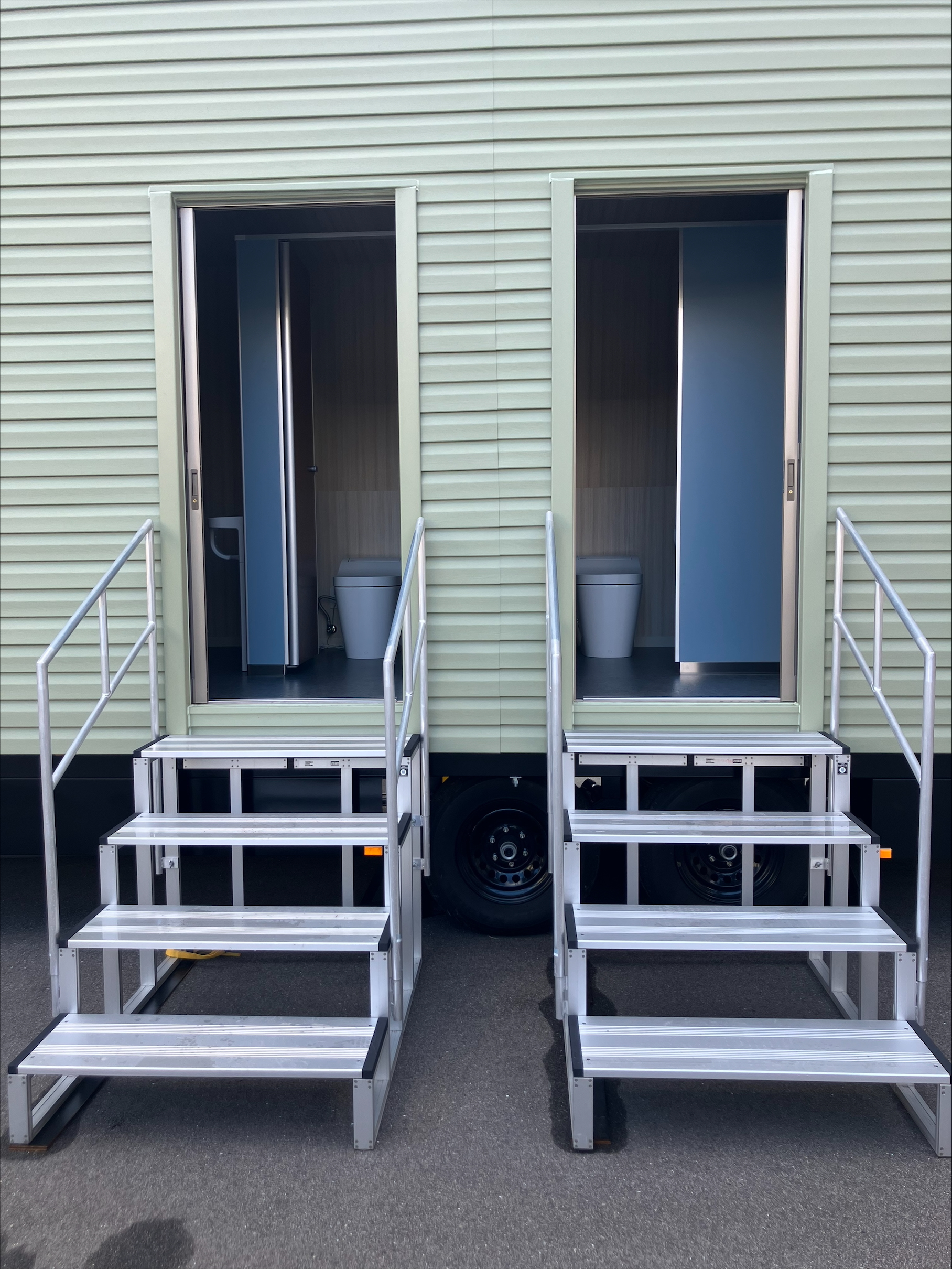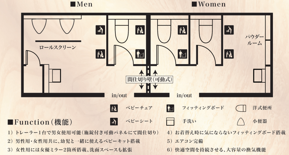 トレーラー内には施錠可能な間仕切り扉を設けており、1台で男女それぞれのスペースを確保できます。
