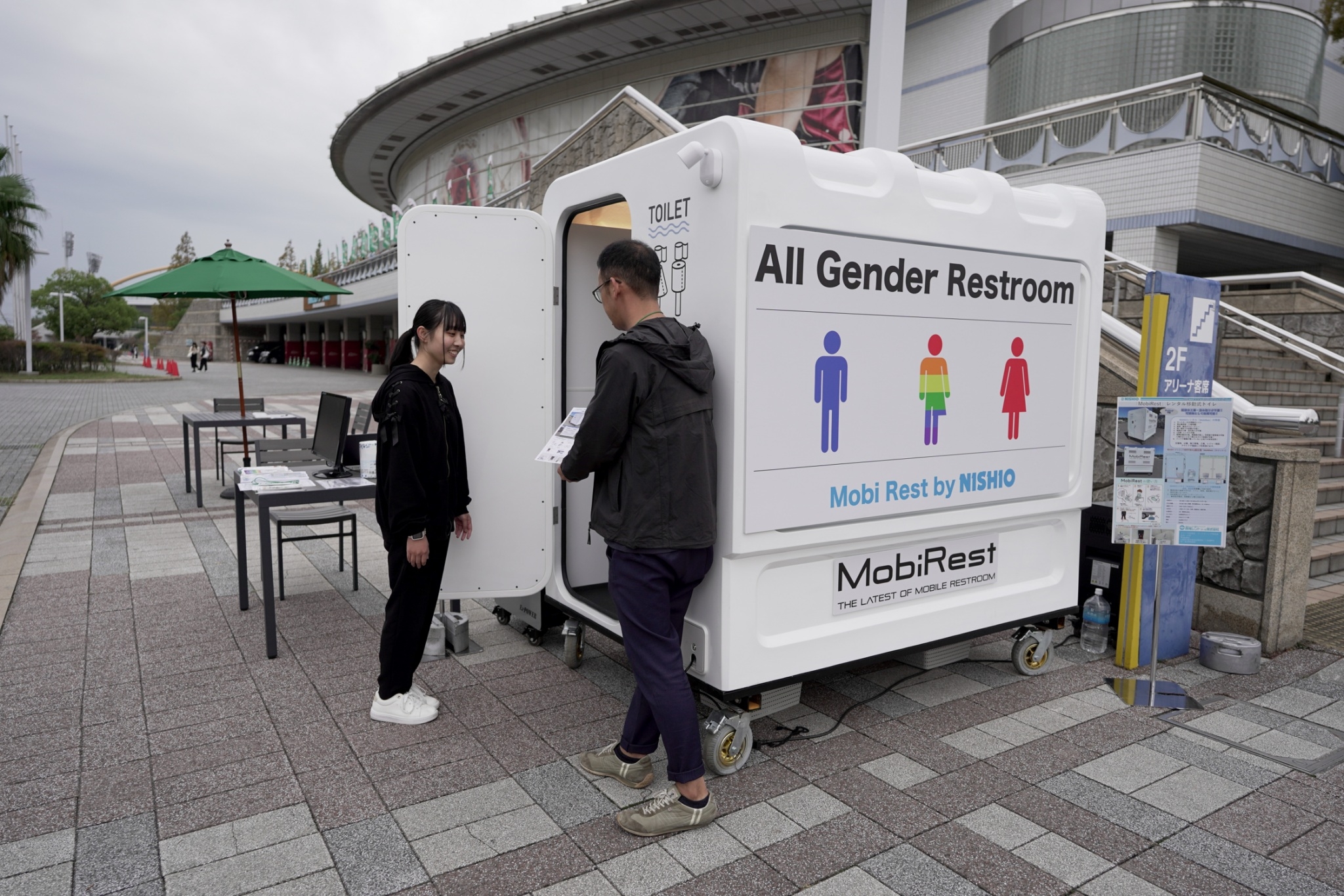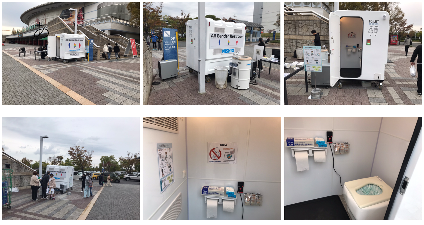 プロバレーボールチームのホームアリーナであるおおきにアリーナ舞洲は男性用・女性用のトイレはあるものの、性別フリーで使用できるトイレ設備がないため、実証実験としてキャスター付き、2室を有する、性別を問わずだれでも使用可能な仮設のレンタル型トイレ「モビレスト」を設置させていただきました。