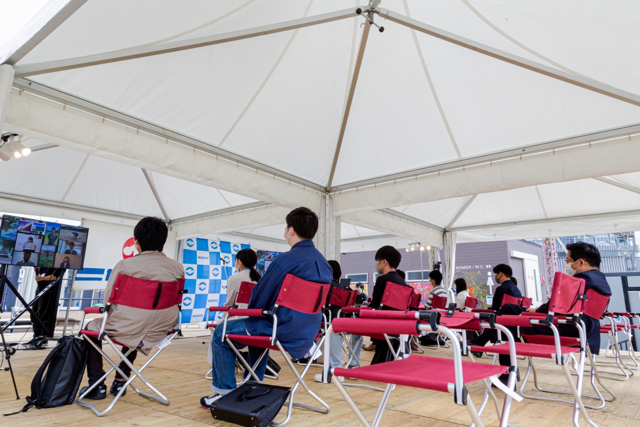 本社機能を屋外に移転し、「有事の際、仮設の通信環境の下で普段通りの“業務”をおこなえるのか?」「屋外でのオフィスワークが働く人にどのような影響をあたえるのか?」「風対策のために何ができるのか?」をはじめとした各種データや問題点を抽出する実証実験「MIDORIオフィス」を実施しました。スタートアップ企業や関西大学社会学部とのコラボレーションによる屋外ゼミ、内定者研修、近隣の皆様にもご参加いただける週末イベント等も開催しました。