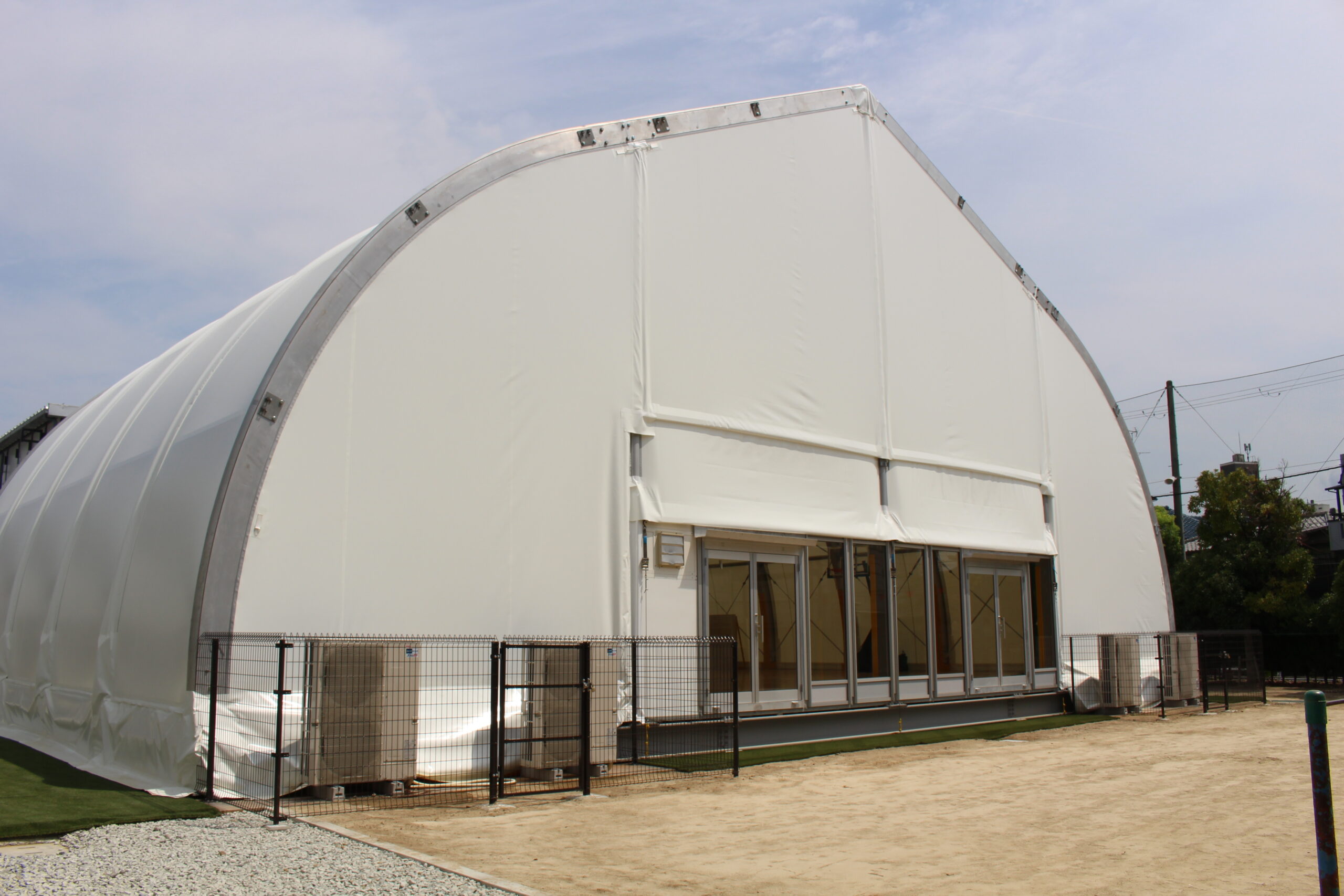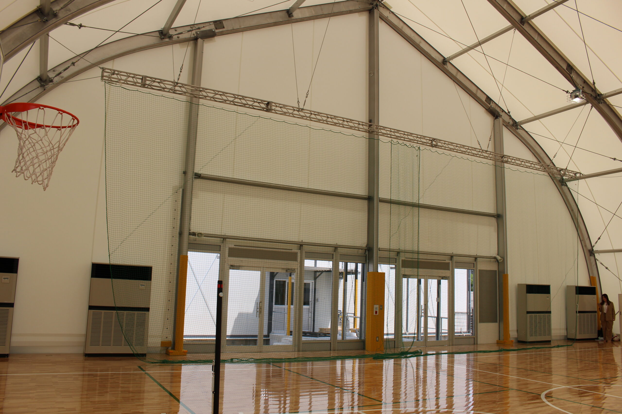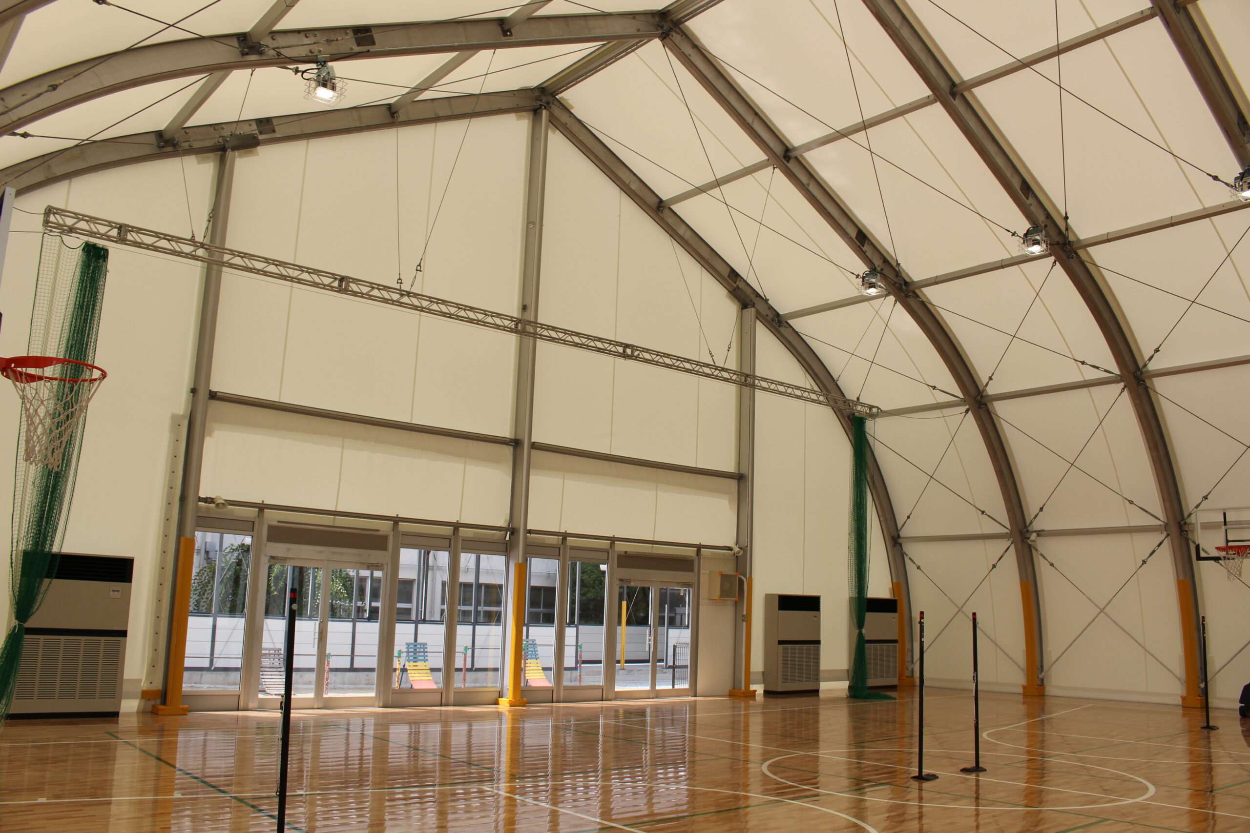 TFSテントという大型のテントを用いてバスケットボールコート1面分の広さと高い天井高、バスケットゴールやバドミントンのネット用ポールを備え付けています。