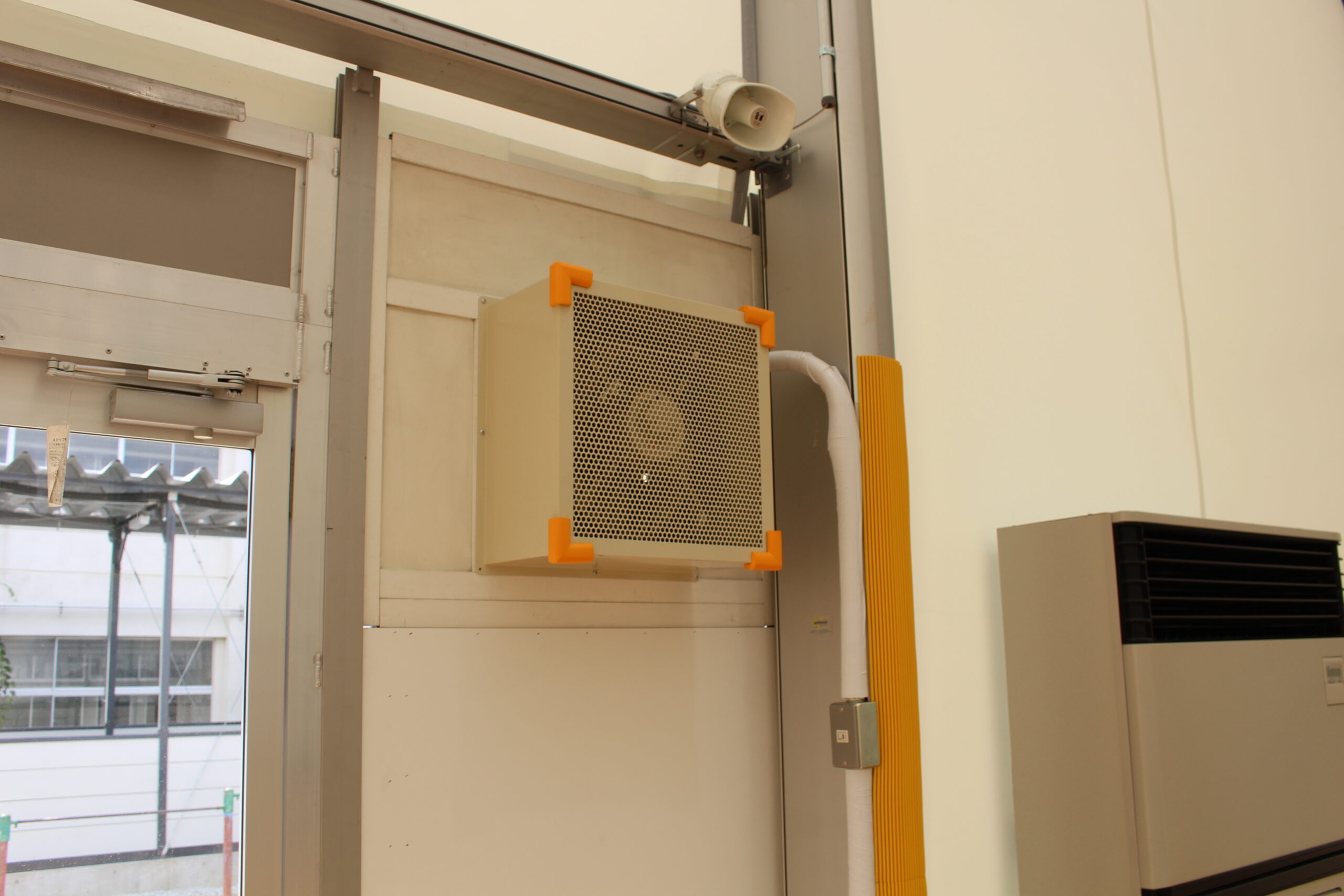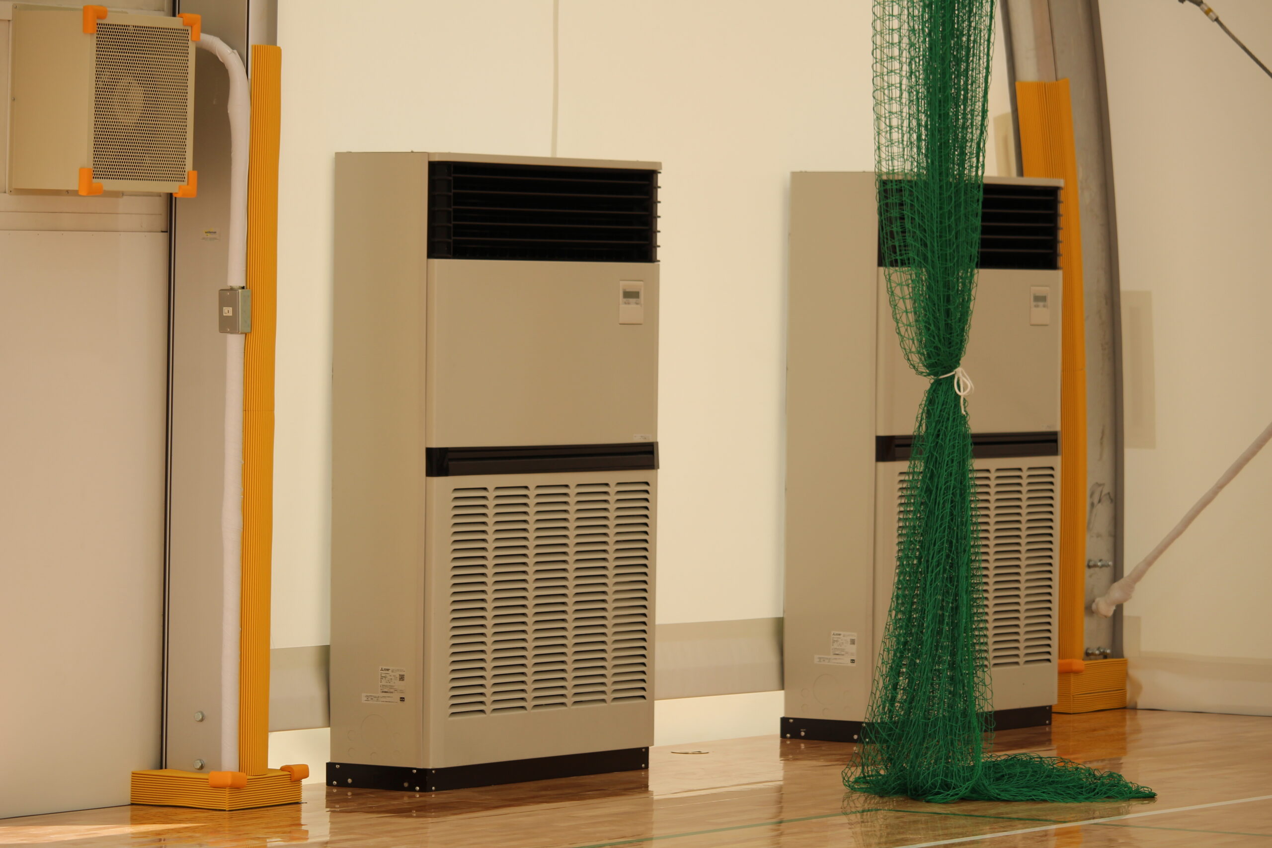 夏や冬にも快適に使用できるようエアコンを設置。換気扇には保護カバーを装備しています。