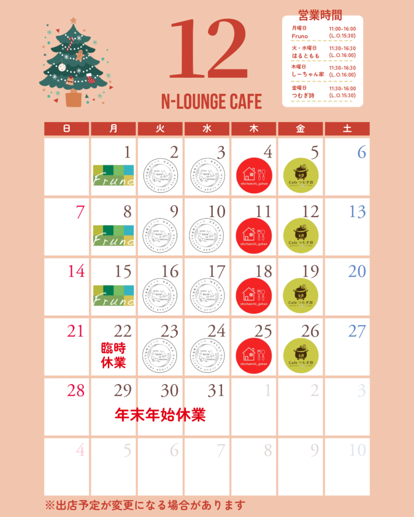 N-LOUNGE CAFÉ/12月営業スケジュール / N-LOUNGE / By sakishima_nishio 店舗SNS 🍕Fruno Instagram/@fruno2023☕米粉スイーツとランチのお店 はるともも Instagram/@harutomomo_sweetslesson🍙しーちゃん家 Instagram/@shichanchi_gohan🍳心をみたす、野菜とごはん Cafeつむぎ詩 Instagram/@cafe_tsumugiuta ■シェアカフェスペース設置の狙い 西尾レントオール咲洲R&D国際交流センターでは、「産官学民交流」を1つの軸に置き、地域に根ざした施設として活用していただくことを目指します。その一環として、カフェ等開業へのトライアル出店に向けた場の提供を行い、スタートアップの支援を行います。 出店をご希望される方は、下記お問い合わせフォームよりご連絡ください。→お問い合わせフォーム N-LOUNGEとは 近隣住民やワーカー、どなたでもご利用いただけるシェアスペース。ラウンジ併設のカフェスペースを中心に、スタートアップ事業者の支援や地域に根ざした施設として活用していただくことを目指します。 住所:〒559-0034 大阪府大阪市住之江区南港北1-12-75 R&D国際交流センターA棟2階 営業時間:月~金、9:00~17:00 設備:机、椅子、無料Wi-Fi、トイレ、自動販売機 N-LOUNGE CAFÉ/12月営業スケジュール 2025年12月1日 コメントはまだありません 店舗SNS 🍕Fruno Instagram/@f Read More » 【クラブ活動報告】立命館大学EDGE+Rプログラム×西尾レントオール 協働プロジェクト 2025年11月21日 コメントはまだありません 咲洲コミュニティガーデニングクラブ 活動2回目「手 Read More » 【イベント】ペデストリアンデッキにアートの力を ~11/17(月)から生命の老松展が始まります!~ 2025年11月19日 コメントはまだありません 2025年11月17日(月)~2026年1月16日 Read More » 【参加者募集!】第1回みんなの作品展 ぬりえコンテストを開催します! 2025年11月10日 コメントはまだありません ニシオホールディングス株式会社傘下の西尾レントオー Read More » 【クラブ活動報告】立命館大学EDGE+Rプログラム×西尾レントオール 協働プロジェクト 2025年10月29日 コメントはまだありません 咲洲コミュニティガーデニングクラブ 活動1回目「秋 Read More » 【未来の担い手を育む】南港北中学校の職場体験学習をR&D国際交流センターにて実施 2025年10月22日 コメントはまだありません ~建設機械業界の理解促進と「ものづくり」を通じた創 Read More »