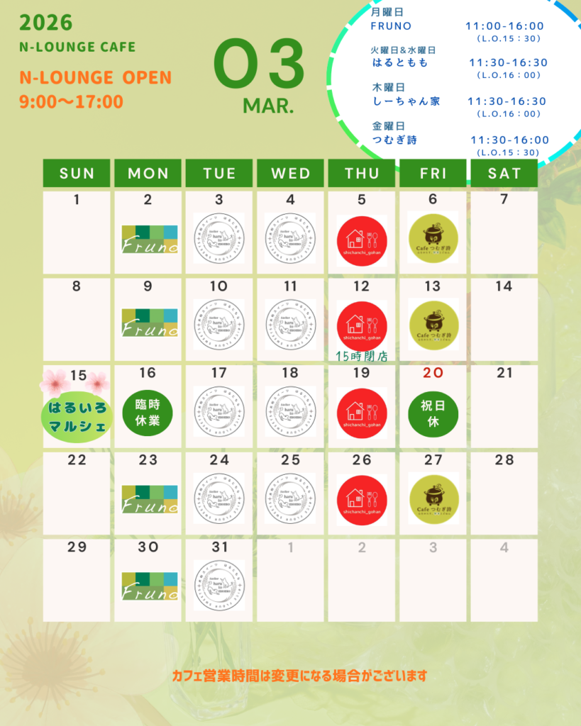 N-LOUNGE CAFÉ/3月営業スケジュール / N-LOUNGE / By sakishima_nishio 店舗SNS 🍕Fruno Instagram/@fruno2023☕米粉スイーツとランチのお店 はるともも Instagram/@harutomomo_sweetslesson🍙しーちゃん家 Instagram/@shichanchi_gohan🍳心をみたす、野菜とごはん Cafeつむぎ詩 Instagram/@cafe_tsumugiuta ■シェアカフェスペース設置の狙い 西尾レントオール咲洲R&D国際交流センターでは、「産官学民交流」を1つの軸に置き、地域に根ざした施設として活用していただくことを目指します。その一環として、カフェ等開業へのトライアル出店に向けた場の提供を行い、スタートアップの支援を行います。 出店をご希望される方は、下記お問い合わせフォームよりご連絡ください。→お問い合わせフォーム N-LOUNGEとは 近隣住民やワーカー、どなたでもご利用いただけるシェアスペース。ラウンジ併設のカフェスペースを中心に、スタートアップ事業者の支援や地域に根ざした施設として活用していただくことを目指します。 住所:〒559-0034 大阪府大阪市住之江区南港北1-12-75 R&D国際交流センターA棟2階 営業時間:月~金、9:00~17:00 設備:机、椅子、無料Wi-Fi、トイレ、自動販売機 【たくさんのご来場ありがとうございました!】3月15日(日)開催 サキシマからSTARTしよう-Vol.4- はるいろマルシェin N-LOUNGE 2026年3月19日 コメントはまだありません 2026年3月15日(日)R&D 国際交流 Read More » 【クラブ活動報告】立命館大学EDGE+Rプログラム×西尾レントオール 協働プロジェクト 2026年3月4日 コメントはまだありません 咲洲コミュニティガーデニングクラブ最終回 Read More » 【出店者決定!公開情報 第2弾】3月15日(日)開催 サキシマからSTARTしよう-Vol.4- はるいろマルシェin N-LOUNGE 2026年2月21日 コメントはまだありません 2026年3月15日(日)R&D 国際交流 Read More » 【クラブ活動報告】立命館大学EDGE+Rプログラム×西尾レントオール 協働プロジェクト 2026年2月20日 コメントはまだありません 咲洲コミュニティガーデニングクラブ 活動5回目 最 Read More » 【コラム:N-LOUNGE CAFÉ 卒業生は今…】N-LOUNGEで出会えた仲間と夜カフェコラボ企画が実現! 2026年2月16日 コメントはまだありません R&D国際交流センターでは開設当初より、スタートア Read More » 【展示スタート!】第1回みんなの作品展 ぬりえコンテスト79名の作品が集まりました! 2026年1月29日 コメントはまだありません 2026年1月26日(月)より、R&D 国 Read More »