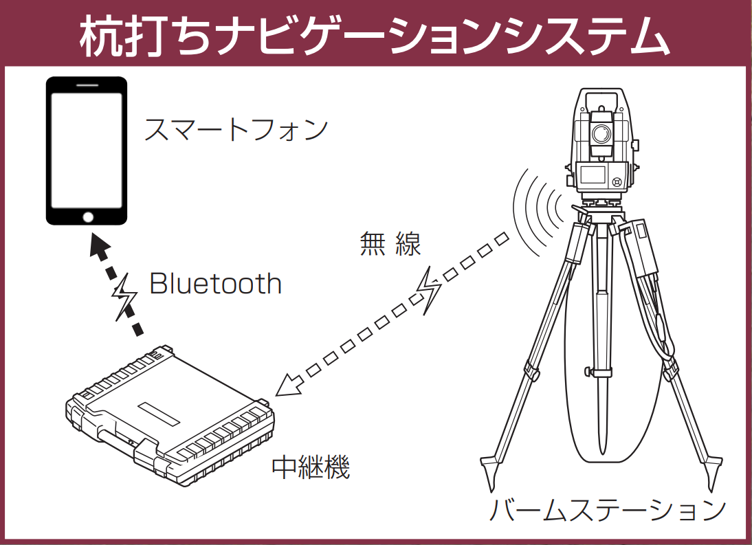 ・「 バームステーション」(専用ト−タルステ−ション)で杭の中心を2点計測した後、携帯端末(スマートホン)に予め登録している杭打ち機の基準面情報から杭の中心軸の傾きと位置を瞬時に計算します。
