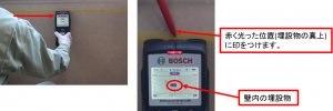 ①マスキングテープ等を探知側面に張り、測り始めと測り終わりの部分に印をつけます。40センチ以上測ることより精密に探知することができます。