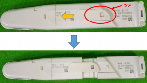 ③電池交換後本体とセンサーを取り外しとは逆の手順で取り付け、ツメが本体の突起にセットされていることを確認して電池交換は完了です。