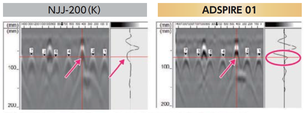 時間分解能の向上により、上下で接近した対象物からの信号が分離可能。これまで判断しづらかった鉄筋直下の反射も判別しやすくなりました。