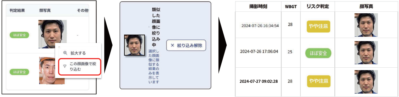 | ■AIカメラに顔を約3秒かざすだけで熱中症リスクを判定し、判定結果は直感的に分かりやすい4色+コメントで表示 ■専用に学習されたAIによる顔の変化の推定とWBGTの外環境情報を統合して、熱中症リスクを推定 ■防塵・防水対策した専用タブレットを設置し、起動すればすぐに使用可能で、管理運用も簡便 ■取得情報(作業者の判定結果)は管理画面に一元集約され、手元のPCからいつでも確認が可能 ■管理者や作業者に気付きを与え、現場全体の予防安全行動を促進 |
