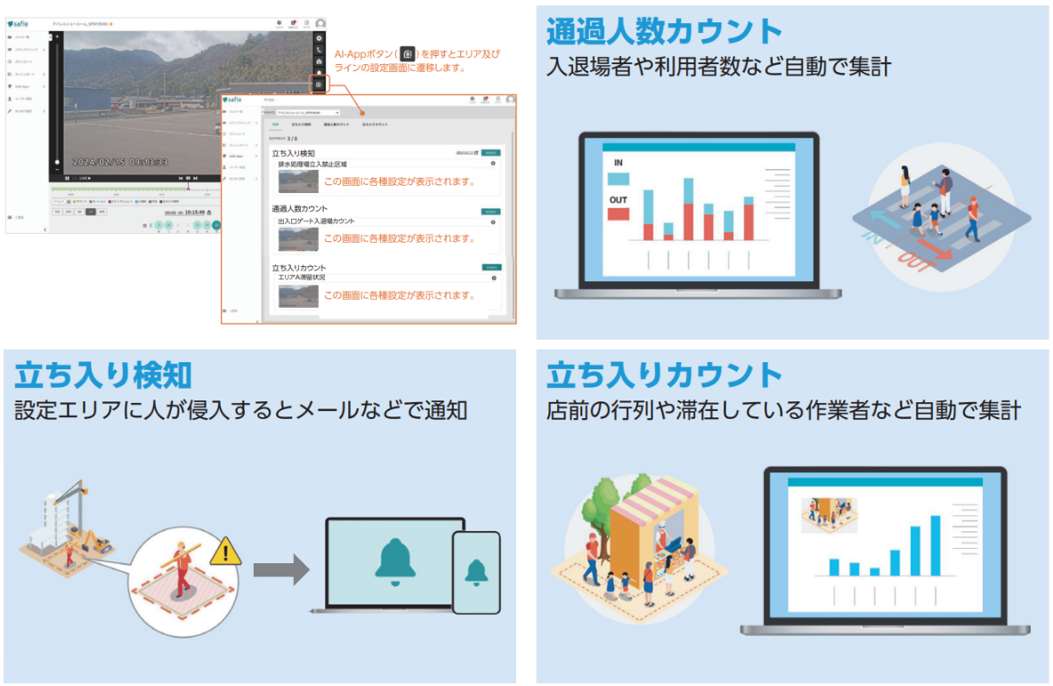 リアルタイムでの現場作業者の立ち入り検知や通行人の人数カウントができます。