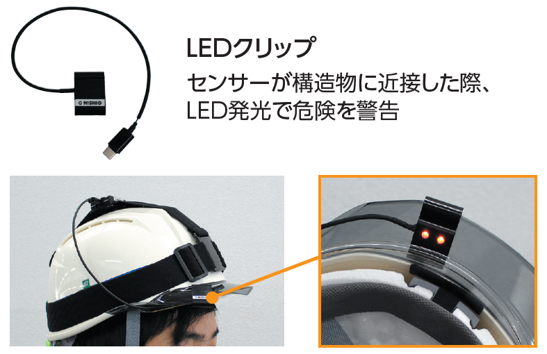 ●設備や構造物に近接すると警報音を発報 ●ベルトフックがついているため、市販のベルトを使用すればどこでも簡単に取付可能 ●小型かつ軽量のため、装着感がなく作業負担を軽減 ●騒音環境下では、LEDクリップを接続することでLED光の点滅による警告に切替可能 |