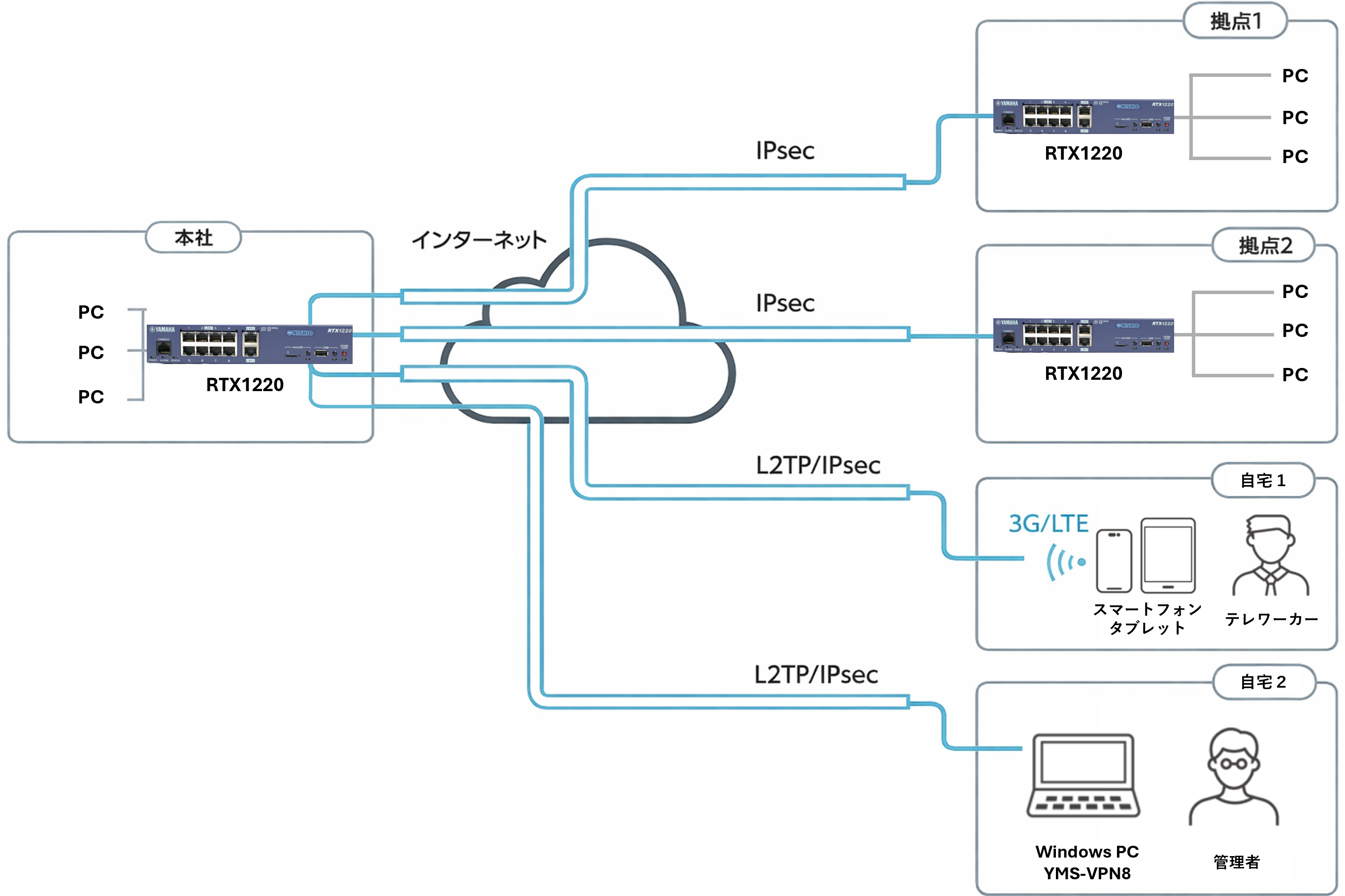 『RTX1220』は、LAN間接続VPNに加えてリモートアクセスVPNにも対応しているため、複数の拠点間通信を行いつつ、テレワーク等によるリモートアクセスも実現します。今後、テレワークへの移行がさらに進みリモートアクセスVPNの需要が増加した場合でも、合計100対地までのVPN接続を安定して収容することができるため、中小規模ネットワークの構築に最適です。また、従来モデル「RTX1210」の洗練されたGUIを継承しており、複雑なネットワーク構成を直感的に把握し、容易に構築することが可能です。