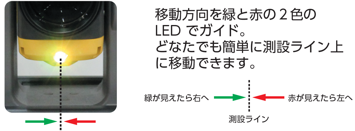 移動方向を緑と赤の2色のLEDでガイド。どなたでも簡単に測設ライン上に移動できます。