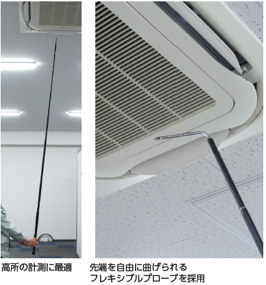 ●3.3 mと長尺の伸縮ロッド一体型プローブで高所も容易に計測可能 ●先端を自由に曲げられるフレキシブルプローブを採用 ●φ13.5mmと小径のプローブはダクト測定口にも挿入可能 ●ケーブル不要の無線 (Bluetooth®) 接続 ●クラス最高の計測精度2%、風速範囲0~30m/sのワイドレンジ測定 |