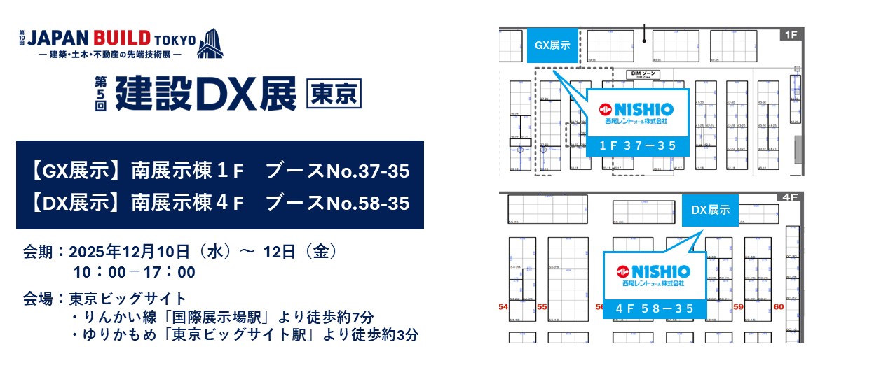 この度、西尾レントオール株式会社(本社:大阪府大阪市、代表取締役社長:西尾公志)は、2025年12月10日(水)~ 12日(金)の3日間、東京ビッグサイト(東京都)で開催される第5回 建設DX展[東京]に出展いたします。